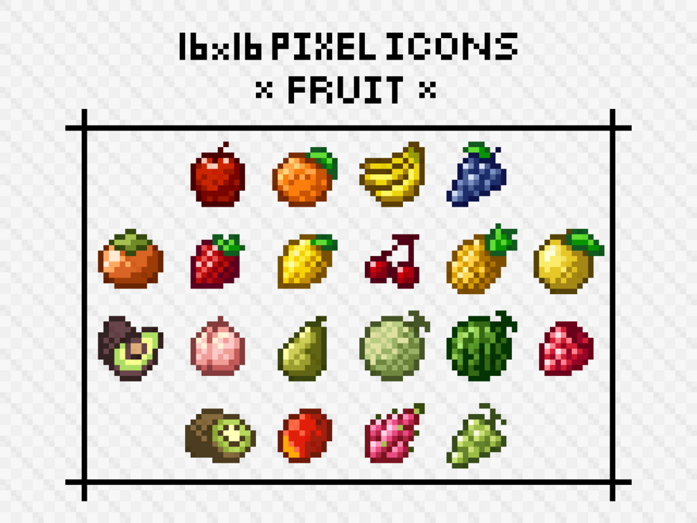 This is a set of Fruit icon assets drawn in 16×16 pixel art. The files are provided in both .png and .aseprite formats, allowing you to freely edit and customize them, such as changing palette colors.